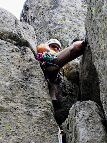 Vlady inicia su tanda de largos, no terminamos creernos que vayamos bien pues el equipamiento de la vía ha dejado de existir, ya no hay ni parabolts ni reuniones ni siquiera un oxidado clavo que nos de una pista, pero por intuición creo que vamos bien, la dificultad de la vía en este tramo está en saber por donde hay que meterse. Entre largo y largo me paso el tiempo contemplando las moles de granito alpino que nos rodea, el silencio es casi absoluto, de vez en cuando es roto por voces en la lejanía, hace tiempo que hemos identificado a otra cordada por el este, están metidos en lo que parece ser una bonita y larga fisura de un risco del que desconocemos el nombre, esos si que están metidos en toda una aventura.
